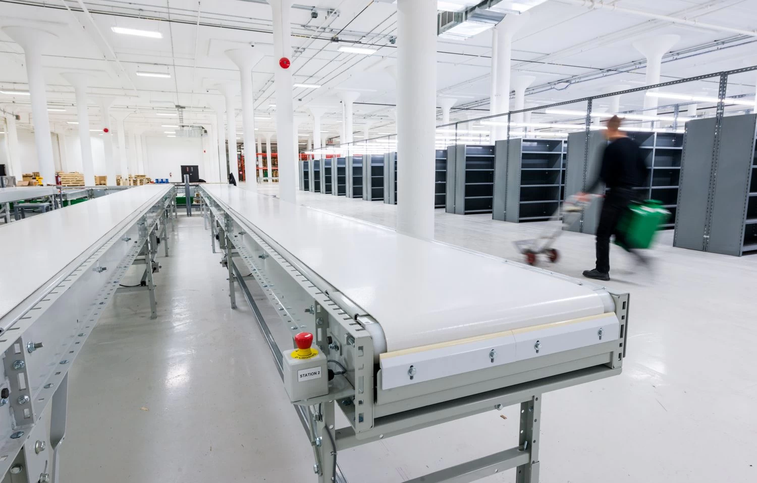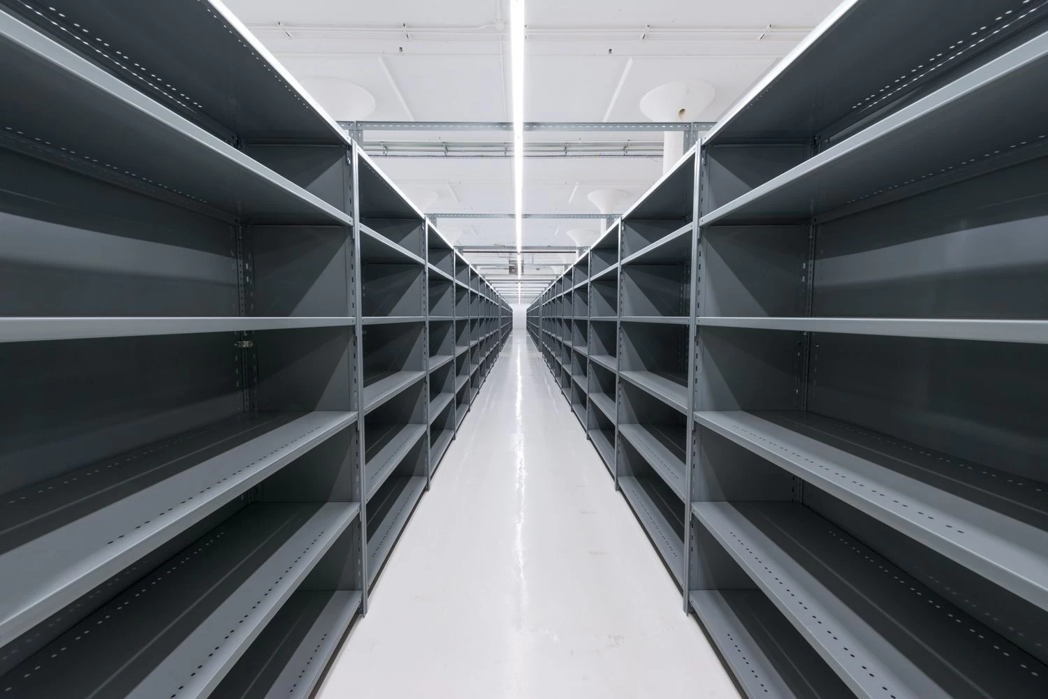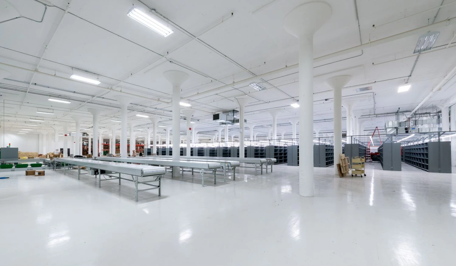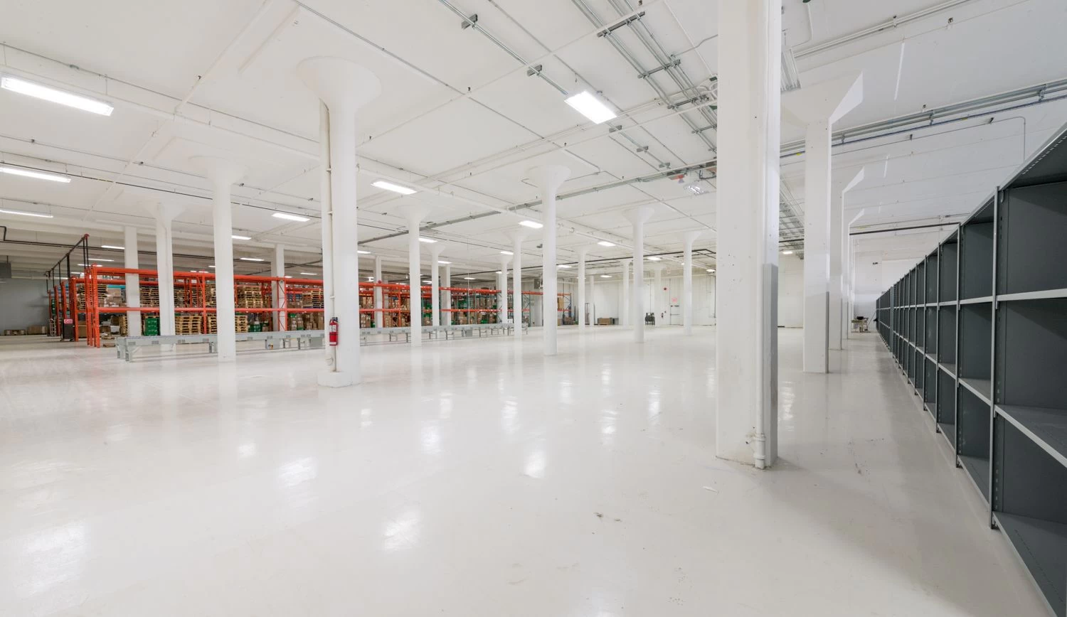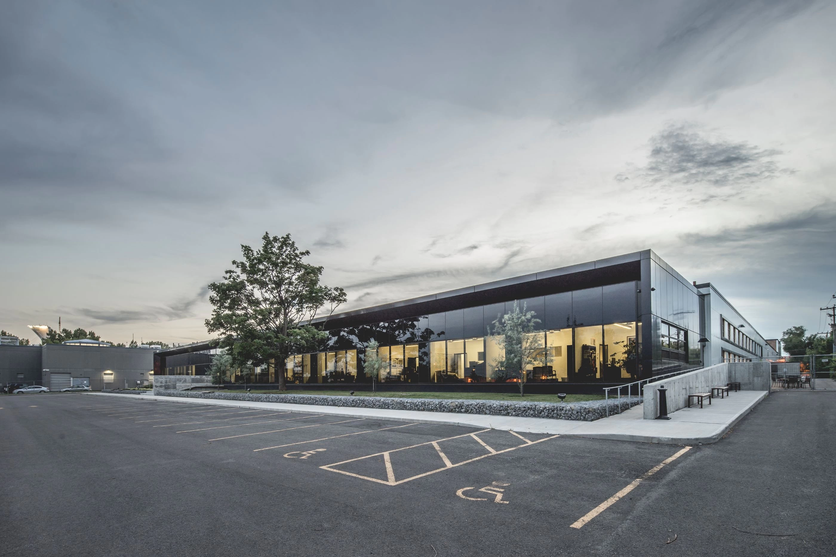 L’arrière du bâtiment, constitué de l’ancienne partie rénovée, reçoit les entrepôts et le centre de distribution de la compagnie. L’espace d’entreposage est une grande aire ouverte épurée et ponctuée par les colonnes de bétons peintes blanches.