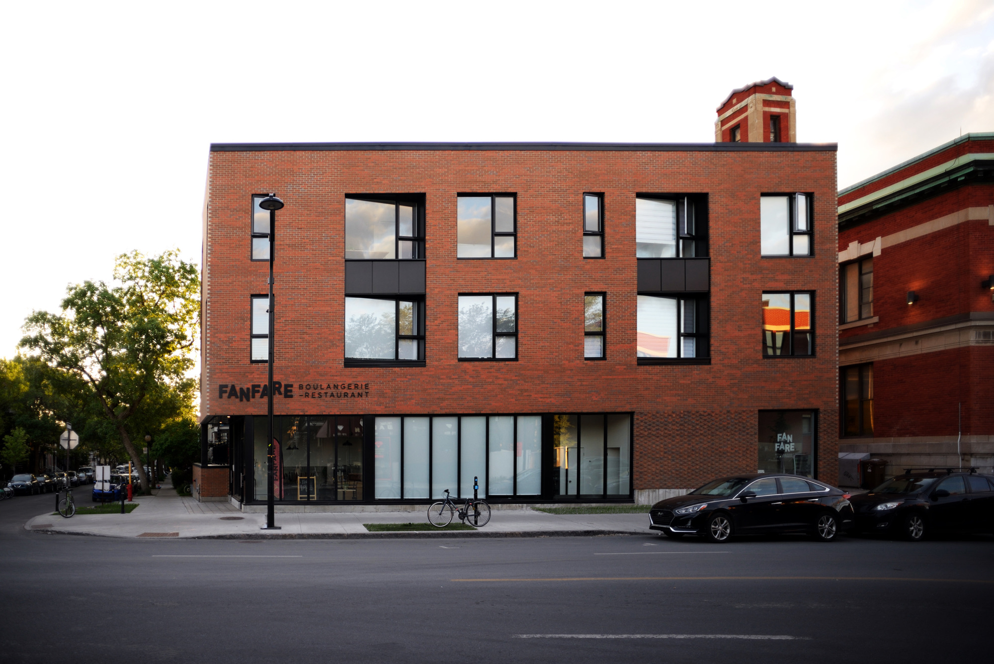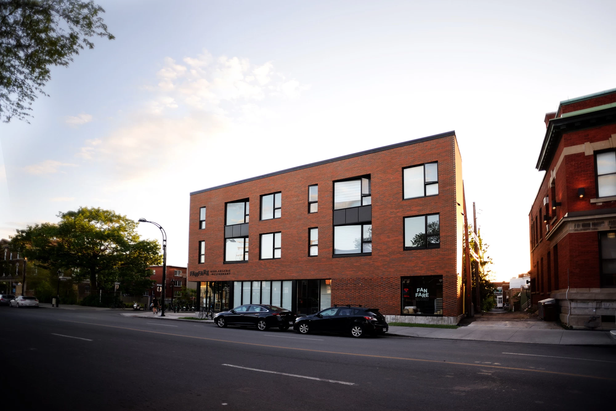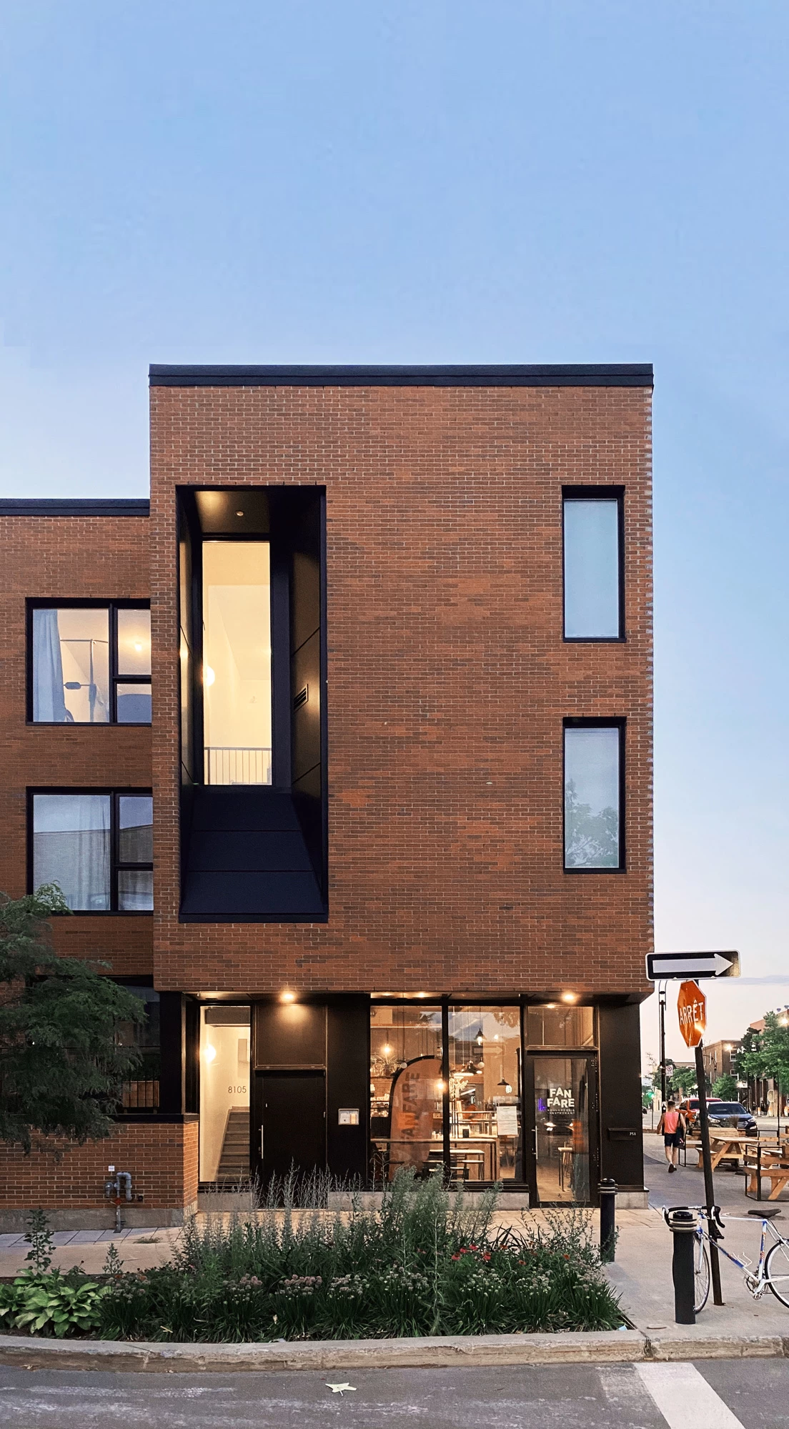 La légèreté du mur-rideau de l’espace commercial qui se déploie sur la majorité du rez-de-chaussée crée un contraste avec la robustesse de la maçonnerie des étages. À son extrémité, un appareillage texturé de briques en boutisse complète et souligne la vitrine commerciale.